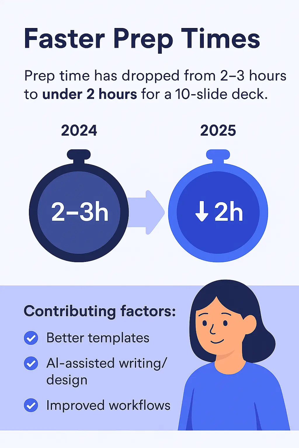 Compared to 2024, prep time has dropped from 2–3 hours to under 2 hours for a 10-slide deck.